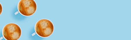 Cups of coffe - black and with milk - on yellow background. Creative concept of hot drinks. Top view, copy space