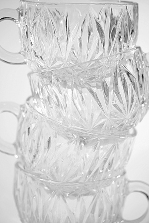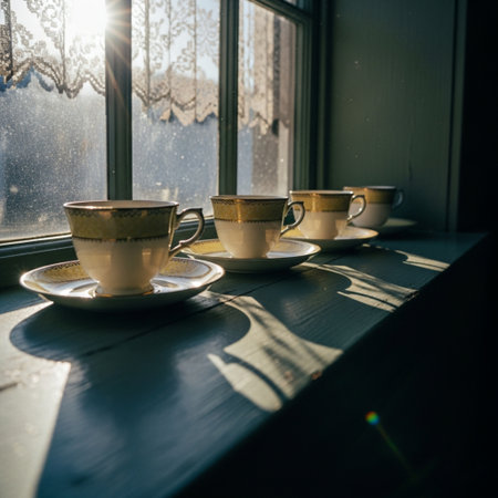 Empty wine glasses on a window sill, sea and sky in the blurred background