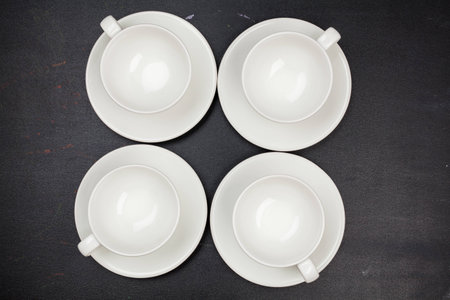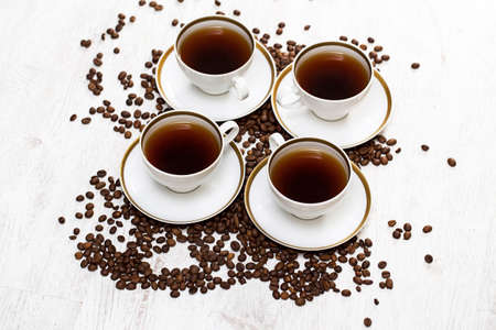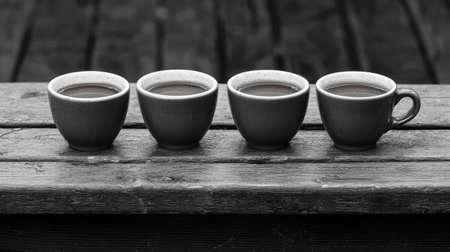 This image features four simple ceramic coffee cups filled with dark liquid arranged on a weathered wooden table, showcasing a minimalist black-and-white aesthetic.