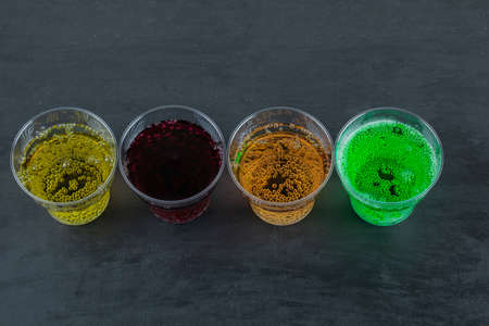 Bowls of colorful jelly, with pieces of fruits. Side view. Copy space. White background. The concept of healthy desserts and home preservation.