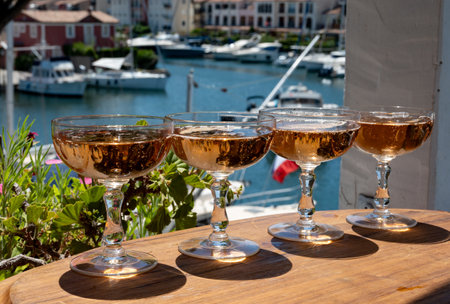 French brut rose champagne sparkling wine in coupe glasses in yacht harbor of Port Grimaud near Saint-Tropez, French Riviera vacation, Var, France is summer
