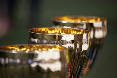 Golden football cup. Sports award. A big cup for victories. The football competition ended with a prize.