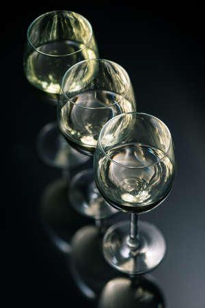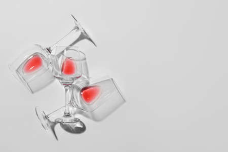 Wine glasses. They stand or lie on a gray background. They are filled with wine and coffee, cranberries.