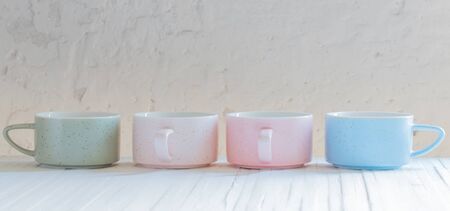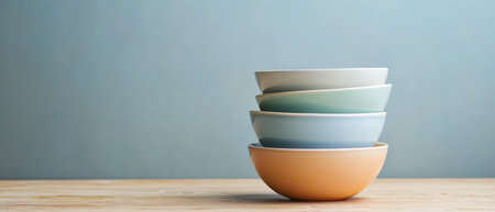 A serene arrangement of four bowls in pastel colors stacked on a wooden table against a light blue background.