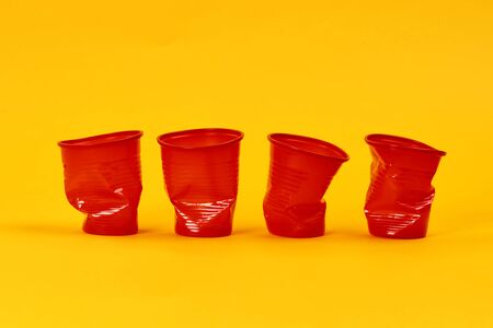 Top view of different beverages - drinking coffe, sparkling water, apple juice and green tea on yellow backgeound. Healthy life and diet concept