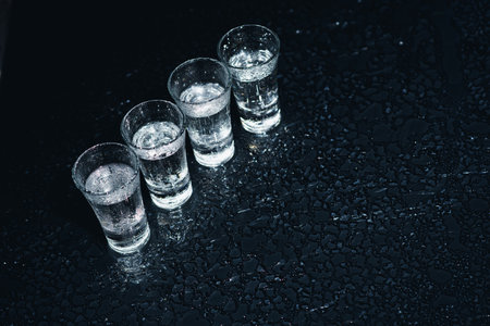Several glasses of brazilian cachaça isolated on rustic wooden background, variations and types of brazil cachaça, typical drink from brazil.