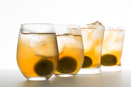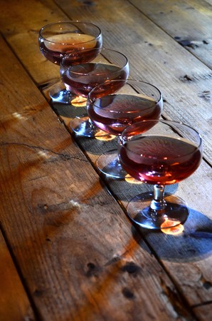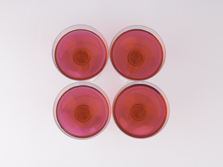 red cocktail in the glasses on white background with soft warming filter. top view.