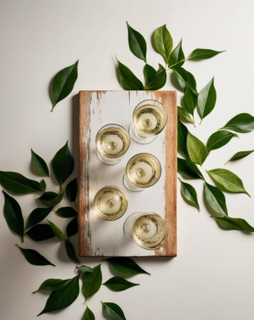 AI Generated. Three Glasses of Sparkling Wine on a Wooden Board with Green Leaves