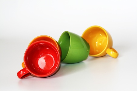 Assorted ceramic multicolored empty bowls on rustic yellow surface. Top view, blank space