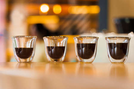 4 Flavored coffee close-up espresso in double glass cup with blurred background. Macro photo of coffee on the wooden table in loft style cafe