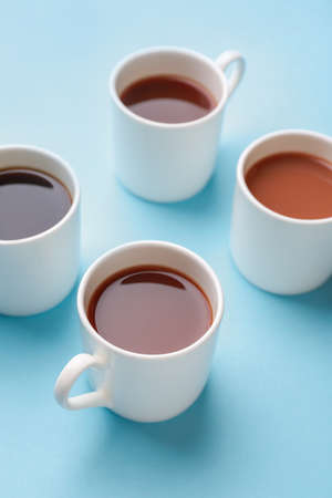 Morning cup of strong coffee with five pieces of sugar in the shape of hearts on blue background.
