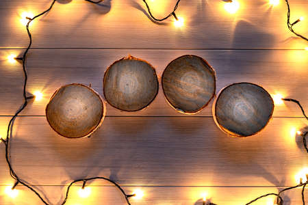 Wooden stump with happy new year decoration. Round cut down tree with annual rings as a wood texture