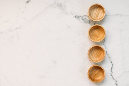 Four beautifully crafted wooden bowls sit elegantly on a polished marble surface, illuminated by soft sunlight filtering through a window, casting gentle shadows.