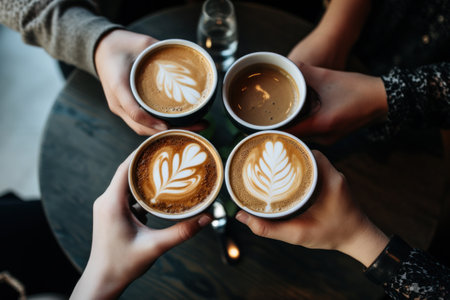 A joyful gathering of friends showcases vibrant mugs filled with warm drinks in an inviting outdoor setting, radiating warmth and happiness.