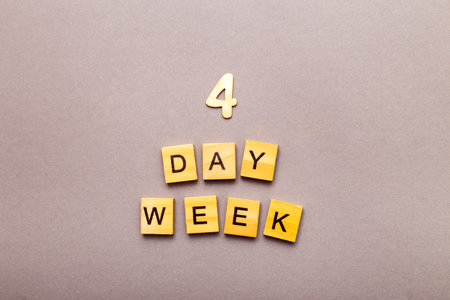 Four day work week concept with wooden letters on gray background