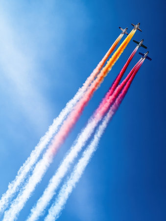 Bright blue sky showcases airplanes performing stunts, leaving colorful smoke trails that create a spectacular display of aerial artistry.