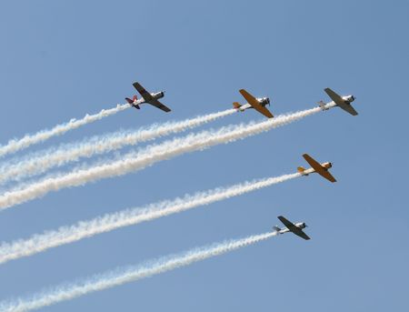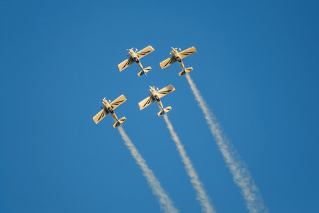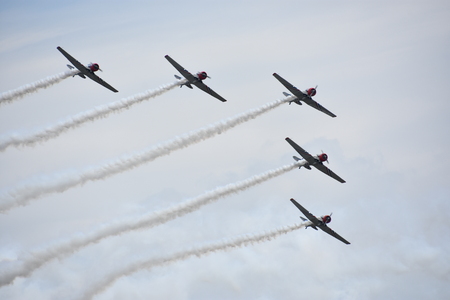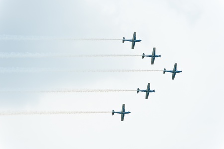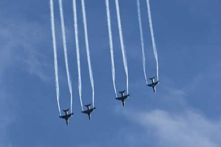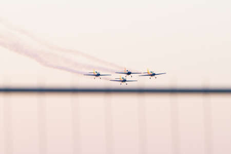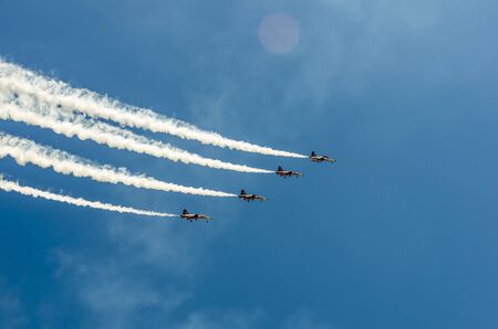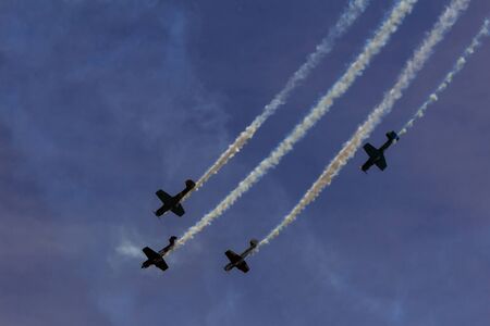 Aerobatics, air show. Aircraft team performing in the sky with white lines and blue sky