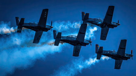 Four aircraft are captured in a dynamic composition against a gradient blue sky. The planes are dark in color, featuring visible contrails from the maneuvers. The image employs an overhead perspective, capturing the movement of the aircraft. This visual could be utilized for various commercial and editorial projects.