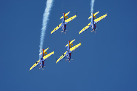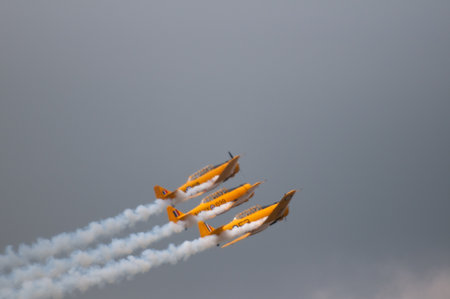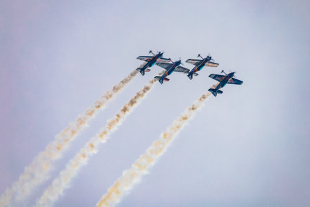 Leszno, Poland - June 16 2023: Antidotum Airshow Leszno 2023 and acrobatic shows full of smoke of The Fyling Bulls Acrobatic Team on a cloudy sky