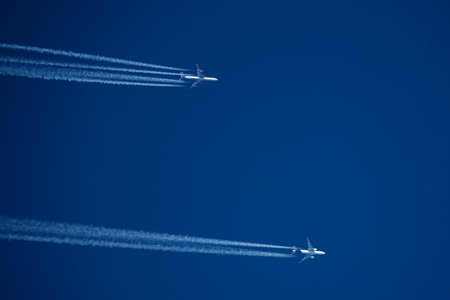 Airplanes in the blue sky. Contrails from two planes flying side by side