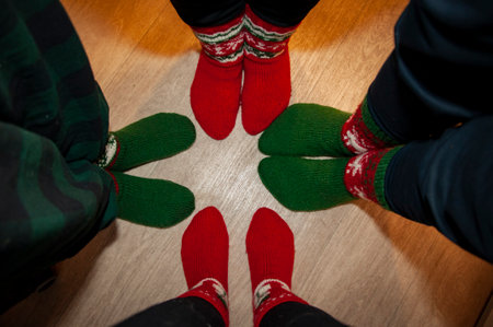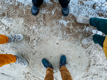 Feet of four people in the snow close-up