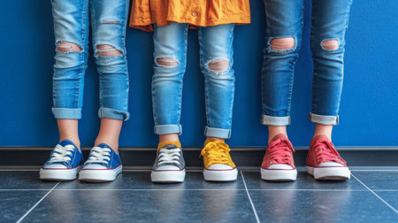 Three kids wearing ripped jeans and colorful sneakers against blue wall. ai generated