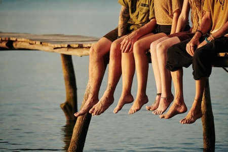 Cropped image of barefoot friends sitting on wooden seaside pier in sunset sunrays