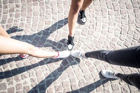 A close-up picture of teenages' legs in white and pink gumshoes standing on a blurred cobbled background. Modern urban hipster teenagers having fun. Copy space. Outdoors, romance, youth concept.