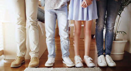 Feet of three people standing in a house