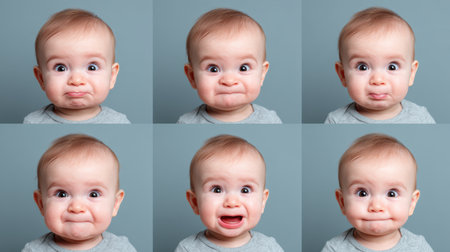 A collage of a baby's expressive face showcasing various emotions, from surprise to joy, against a soft blue background. Perfect for themes of innocence and childhood.