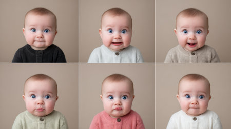 A delightful collection of expressive baby faces, each showcasing a range of emotions. These charming portraits capture innocence and joy against a soft, neutral background.