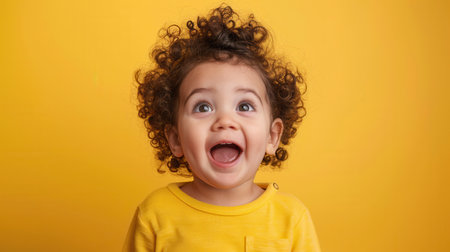 A joyful young child with curly hair beams with delight, surrounded by a striking yellow backdrop in a cheerful environment.