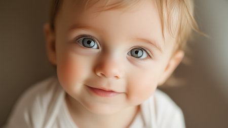 Adorable Baby with Joyful Expression and Bright Blue Eyes Smiles Radiantly on Soft Gray Background