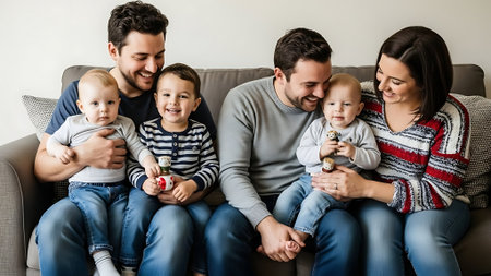 A smiling couple with their young son and baby daughter enjoying a sunny day in a park, embracing and laughing together.