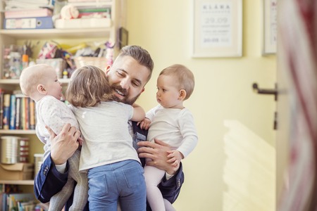 Isolated on grey background, a row of multiethnic babies sit side by side, staring away.