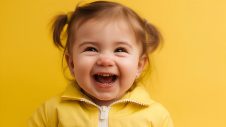 Portrait of a laughing baby girl in a yellow jacket on a yellow background