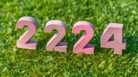 Wooden numbers 2022 on green grass background. New year concept. AI Generative