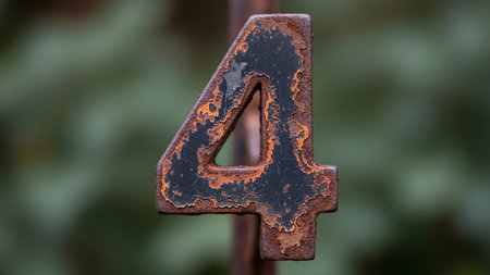 A rusty metal number four on a white background, symbolizing count or quantity.