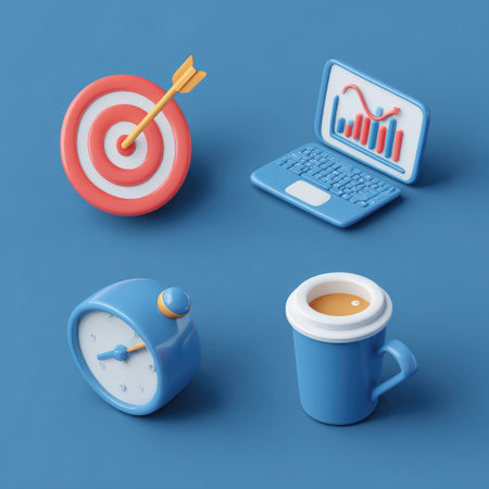 This isometric illustration showcases a collection of business-related objects including a target, laptop, clock, and coffee cup. The objects are rendered in a vibrant blue color palette. The composition is set against a clean background. It could be useful for commercial design, marketing materials or editorial content.