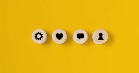 Five wooden dices with global contact and communication symbols on them stacked over blue background. With copy space.