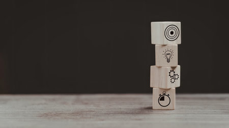 A stack of four wooden blocks, each featuring a different creative symbol.