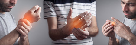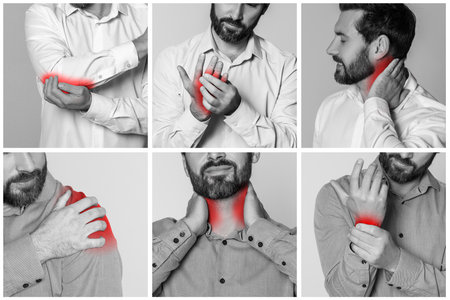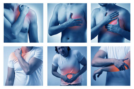 Men suffering from rheumatism, black and white effect with red accent. Collage of photos