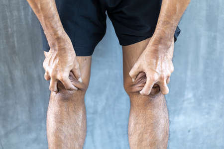 Close up Asian sport runner black man wear watch sitting he uses hands joint hold on his knee while running at the outdoor street health park, healthy exercise Injury from workout concept