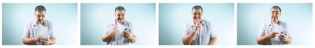 A man with a phone looks at the screen and is surprised. A pleasant surprise. A set of 4 images.