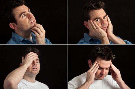 Conceptual portrait with man surrounded by his multiple personalities. Depressed person with multiple personality disorder