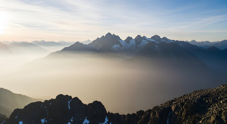A breathtaking landscape of jagged mountain peaks rising above a sea of morning mist and clouds. The soft gradient light highlights the layers of the mountain range, creating a serene and dramatic atmosphere.