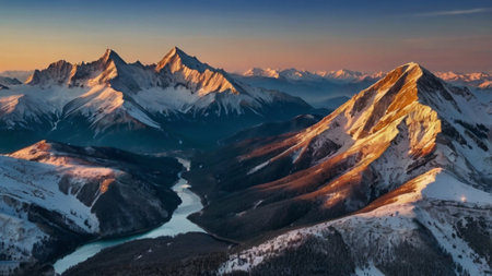 Aerial view of snow capped mountain peaks in Alberta, Canada