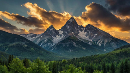Majestic mountains tower over a serene spruce forest beneath a dramatic sky, showcasing nature beauty at dusk. Towering mountains with rolling hills and moody sky highlighting peaceful wilderness. AI.