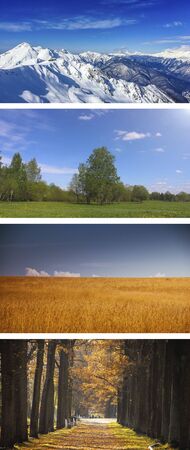 Four seasons landscape collage. Horizontal banner with photos of winter, spring, summer, autumn.Landscapes od mountains, field, meadow and forest in all seasons.