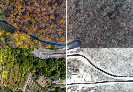 Seasons Concept summer winter fall spring Aerial view Winding road serpentine mountain pass village Brodenbach Germany